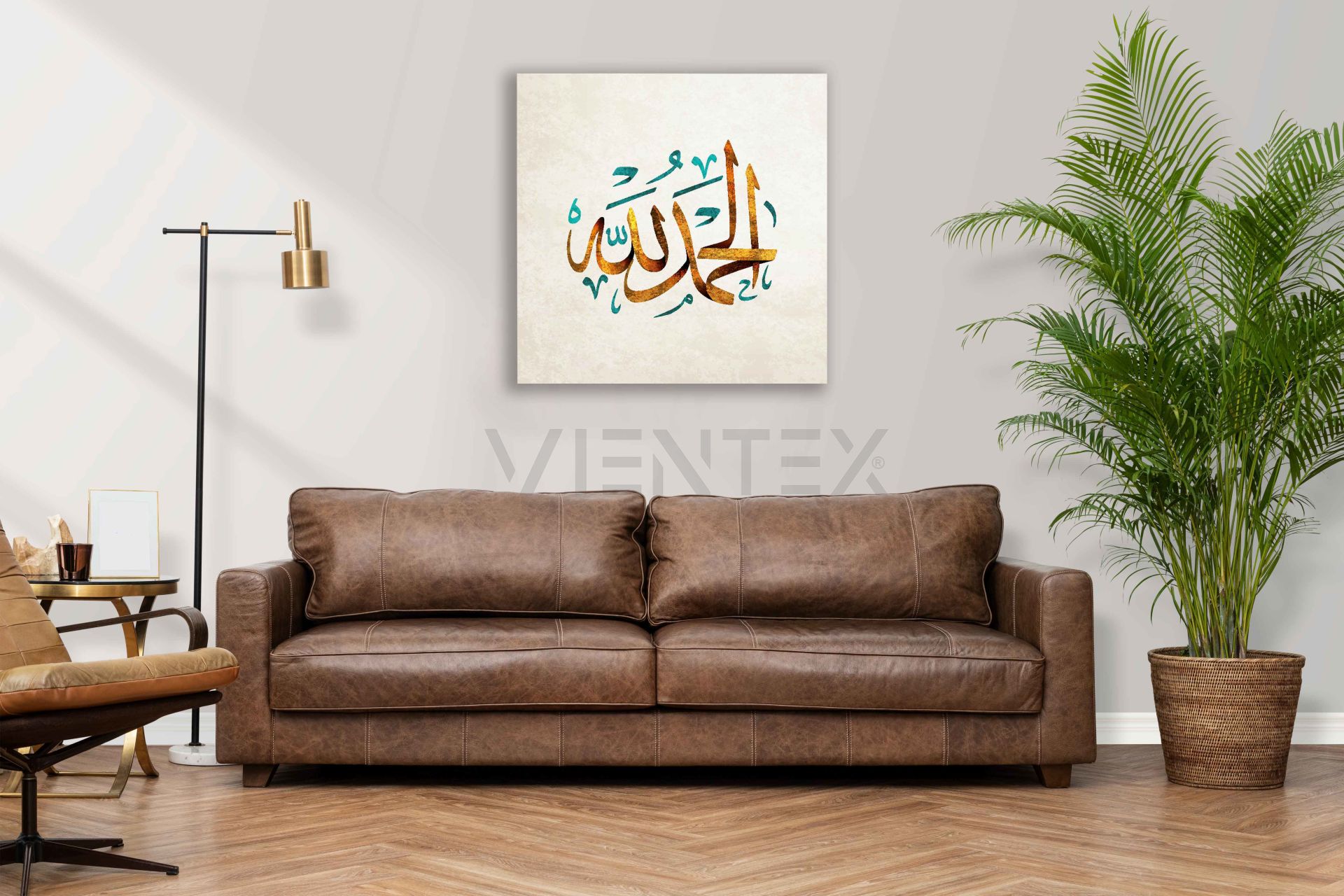 4-) Tablolarda kullanılan şase ve ahşap çerçeveler birinci sınıf çam ağacından imal edilmektedir. Kullanılan çam çerçeveler kurutulmuş ve fırınlanmıştır. Elhamdülillah Dini Tablosu ve diğer tüm ürünlerde ahşap şaseler 2,5x2,5cm kalınlığa sahiptir. Ahşap şaselerinin güçlü yapısı sayesinde, tabloya herhangi bir fiziksel darbe olduğunda dahi güçlü yapısını korumaktadır.