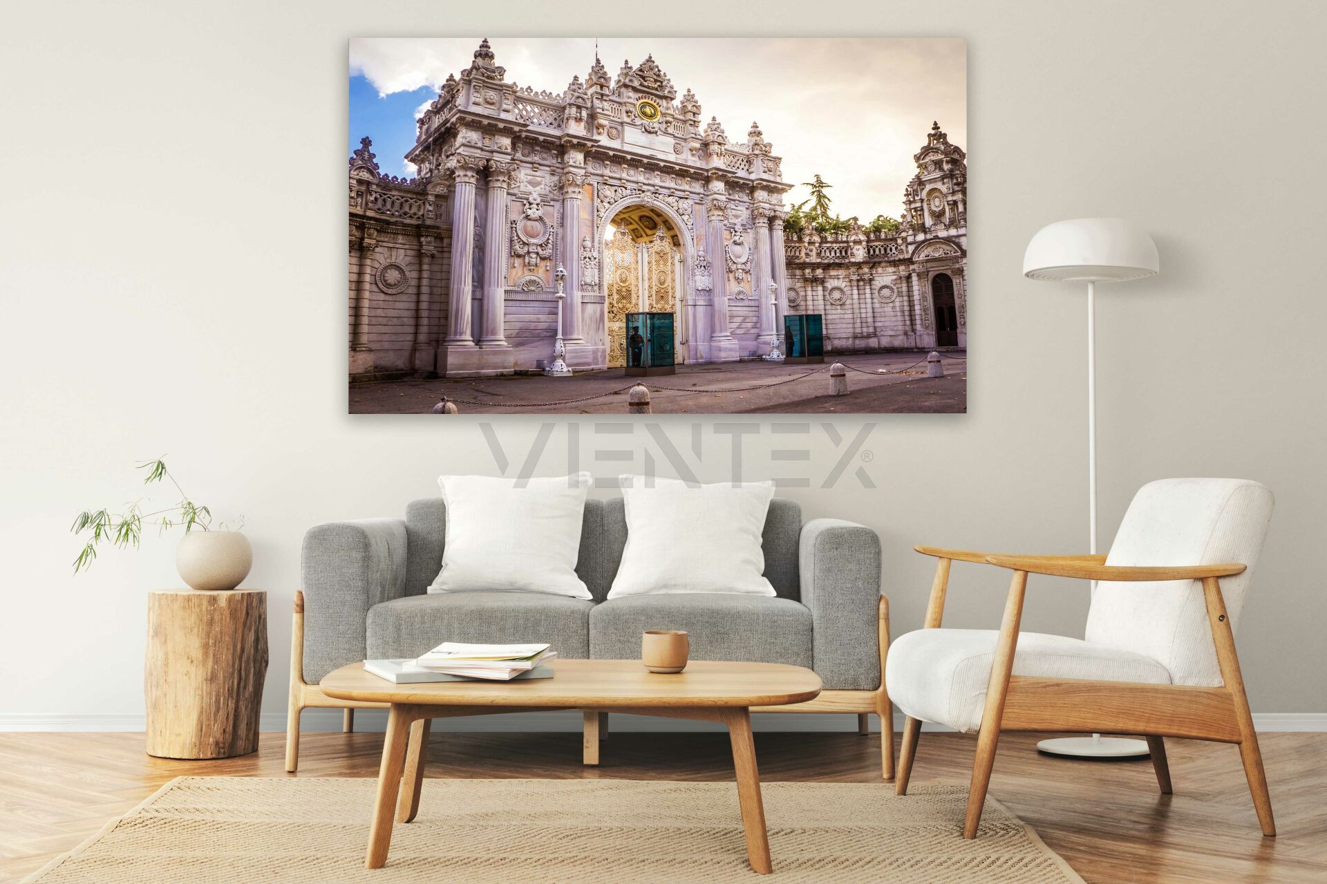 3-) Tüm tablolarımızda 370gr/m2 %100 kaplamalı polyester birinci sınıf kumaşlar kullanılmaktadır. Sağlığa zararlı maddeler bulunmamaktadır. İstanbul Dolmabahçe Sarayı Valide Kapısı Tablosu ve diğer tüm tablolar profesyonel işçilik ile hazırlanmaktadır.