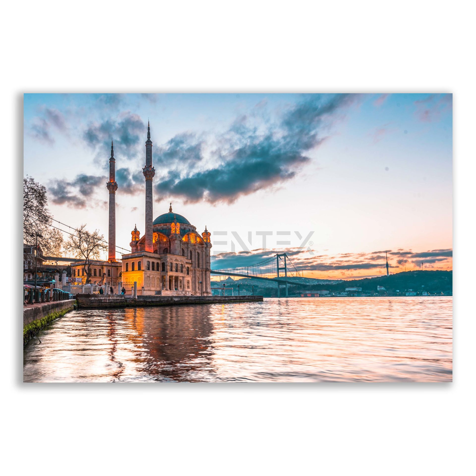 3-) Tüm tablolarımızda 370gr/m2 %100 kaplamalı polyester birinci sınıf kumaşlar kullanılmaktadır. Sağlığa zararlı maddeler bulunmamaktadır. İstanbul Ortaköy Camii Tablosu ve diğer tüm tablolar profesyonel işçilik ile hazırlanmaktadır.