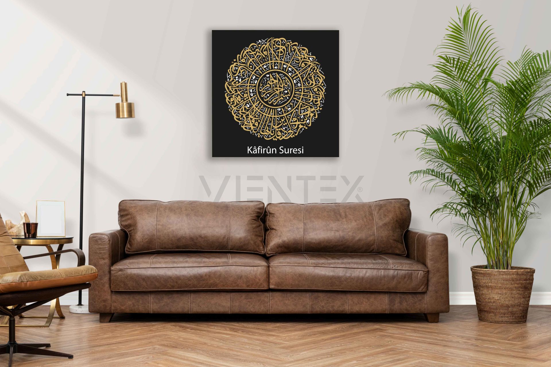 3-) Tüm tablolarımızda 370gr/m2 %100 kaplamalı polyester birinci sınıf kumaşlar kullanılmaktadır. Sağlığa zararlı maddeler bulunmamaktadır. Kafirun Suresi Dini Tablosu ve diğer tüm tablolar profesyonel işçilik ile hazırlanmaktadır.