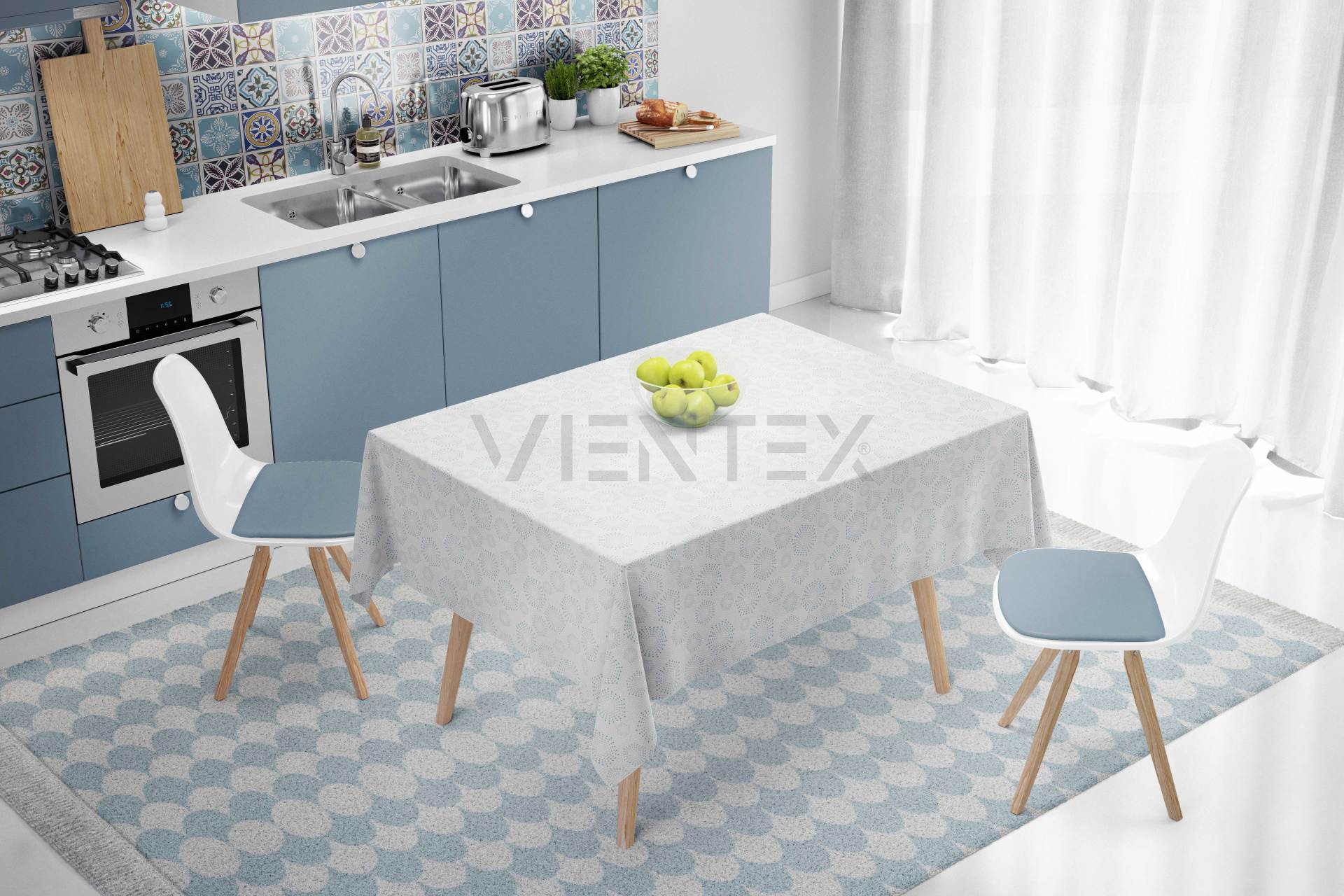 4-) Vientex Masa Örtüleri su geçirmezdir ve yüzey deseni Safir serisidir.